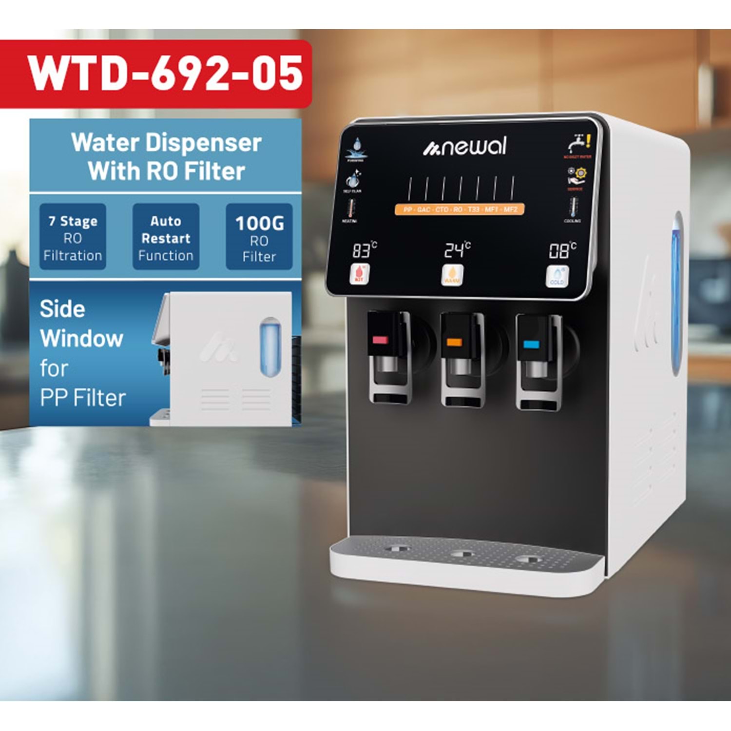 İki adet metal filtre ve çok katmanlı filtreleme sistemi (PP, GAC, CTO, RO 100G, T33)